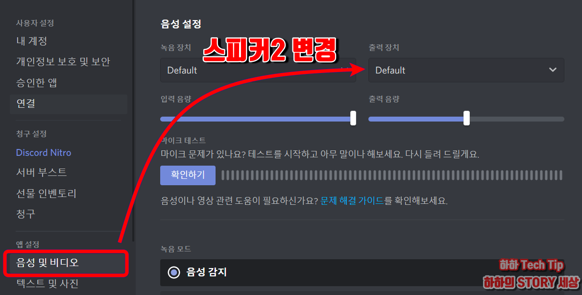 ☞ 사용자 설정 → 음성 및 비디오 → 출력장치 → 스피커2 또는 다른 출력 장치로 변경