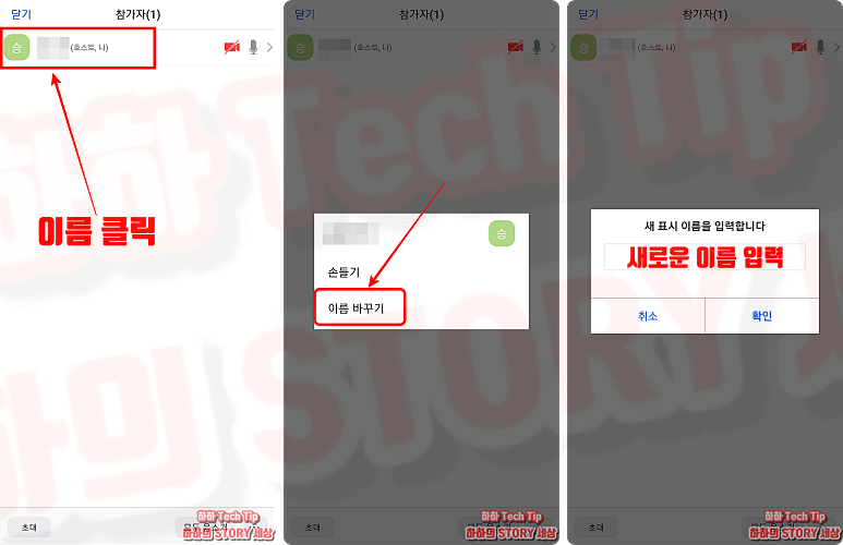 참가자 명단에서 나의 이름을 클릭하면 이름 바꾸기 항목이 나타나며, 선택해서 새 이름으로 변경 후 확인을 누르면 완료된다.
