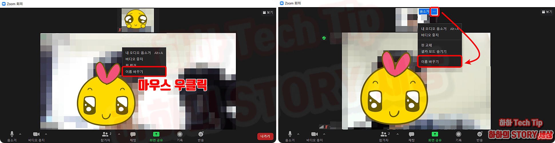컴퓨터에서 이름을 바꾸는 방법은 내가 보이는 큰 화면에서 마우스 우클릭 후 이름 바꾸기를 클릭하고 만약 큰 화면에 상대편이 보이고 나의 모습이 보이는 상단 작은 화면으로 이동되어 있다면 마우스 우클릭 또는 우측 더보기 버튼을 누르고 이름 바꾸기를 선택한다.