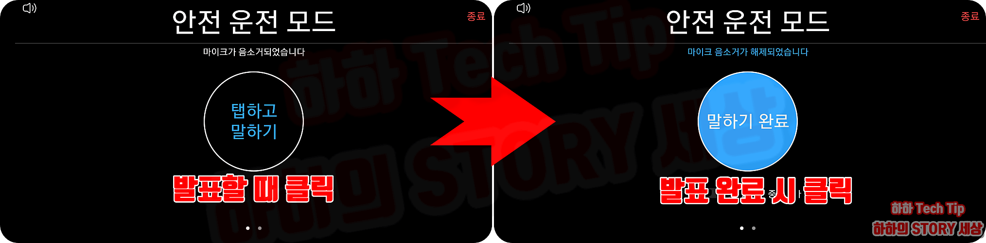 안전 운전 모드 창으로 이동하면 중간에 보이는 탭하고 말하기를 클릭 후 대화를 시작하고 대화가 끝났으면 말하기 완료를 눌러 종료한다.