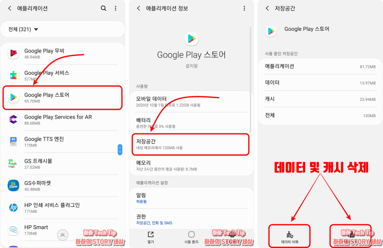 3. 구글 플레이 스토어 사용량 카테고리 중 저장공간을 선택 후 데이터와 캐시 삭제 버튼을 누른다.