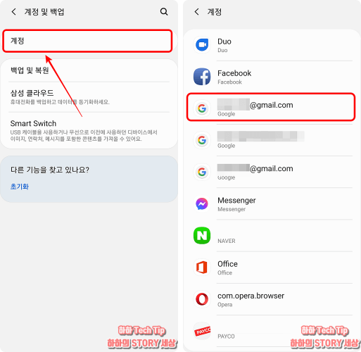 2. 계정 및 백업 창이 나오면 계정 항목으로 이동 후 구글 계정을 선택한다.(만약 구글 계정이 다수라면 인증 대상이 되는 것을 클릭한다.)