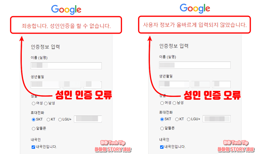 위와 같은 5가지 오류가 발생하는 이유는 개인정보와 스마트폰에 등록된 기록이 서로 달라서 발생하는 원인이 가장 많고 아직 법적 성년이 되지 않거나 정보 오기입 인해서 인증에 실패한다.