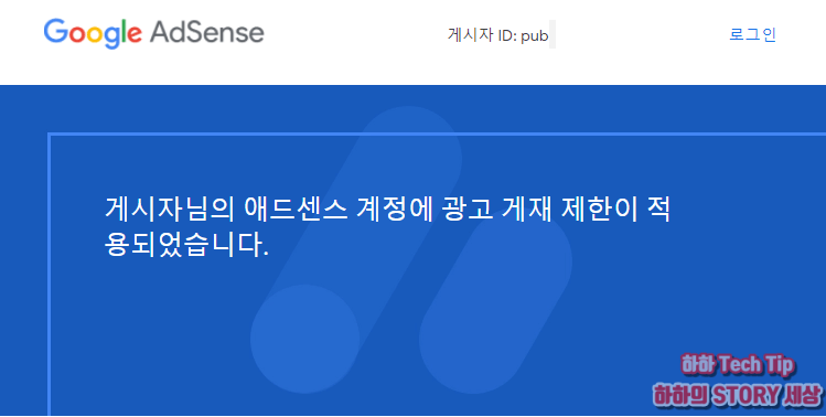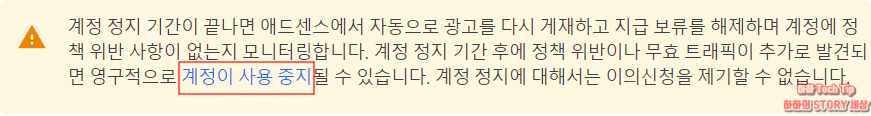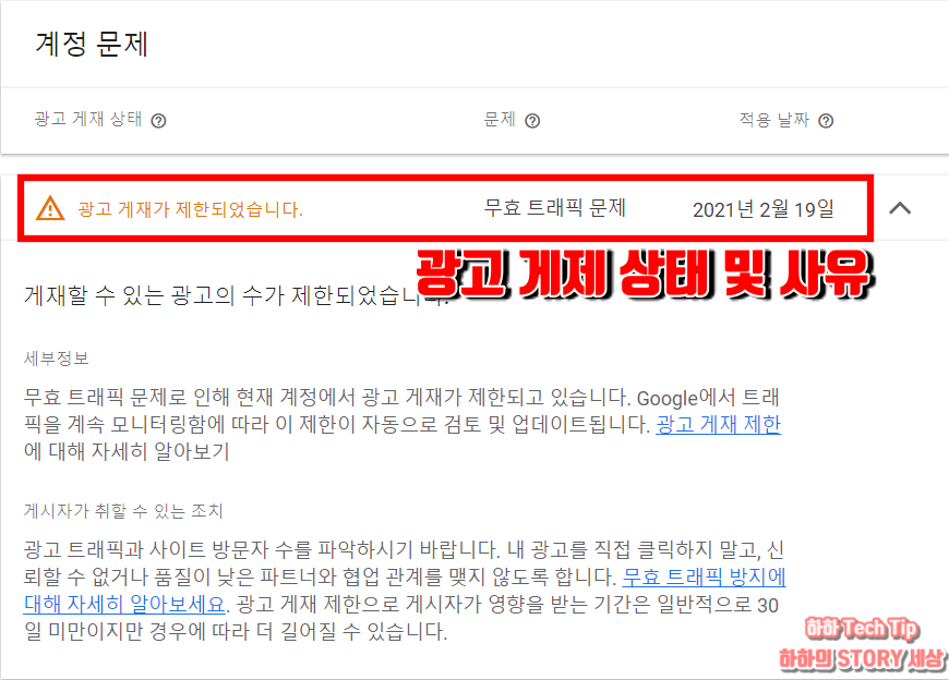 계정에 문제가 있을 경우 평소에는 볼수 없는 내용들이 추가 되었으며, 콘텐츠 광련 경고를 받았을 때는 광고 게재 상태에 변화가 없지만 이번에는 광고 게재 제한 조치가 발생하였다.