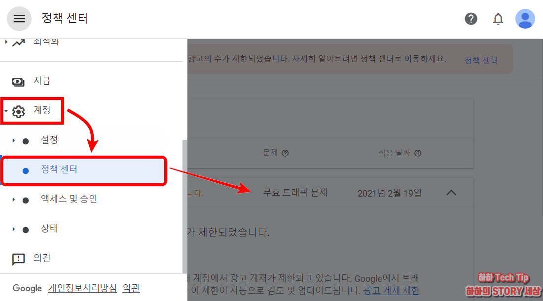 게재 제한에 대해 자세히 알고 싶다면 애드센스로 로그인하여, 좌측 카테고리 중 계정 → 정책 센터를 클릭하면 현재 어떤 제재를 받고 있는지 알 수 있다.