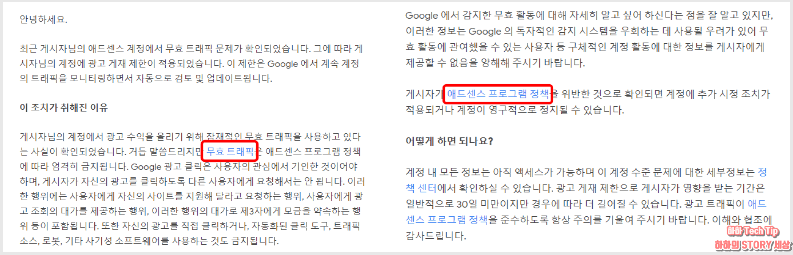 이메일로 접수된 애드센스측의 조치 사유는 수익을 올리기 위해 잠재적인 무효 트래픽을 사용하고 있다는 판단에서다. 애드센스를 시작한 이후에 글 작성하는 것 외에 별다른 활동을 하지 않았고 나의 블로그를 방문해서 의도적으로 클릭도 하지 않았기에 무척 당황했다.