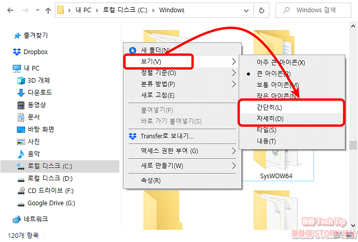 4. 윈도우즈 파일 중에서 System32 폴더를 찾아 내부로 들어간다. 여기부터는 폴더들이 많아 아이콘이 큰 경우 찾기가 힘들 수 있으니 Ctrl+마우스 휠 당기기 또는 마우스 우측 버튼 클릭 → 보기 → 자세히/간단히를 선택하면 보기가 좀 더 편하다.