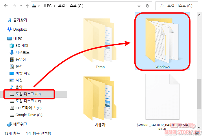 3. 로컬 드라이브에서 Windows 폴더를 찾아 클릭한다. 만약 해당 폴더가 보이지 않는다면 윈도우가 설치된 곳이 아니므로 운영체제가 설치된 곳을 다시 찾아본다.