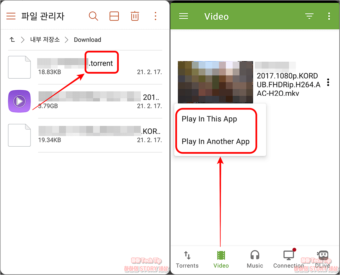 다운받은 파일은 휴대폰 파일 탐색기를 통해 저장된 폴더에서 직접 실행해 보거나 토렌트 자체에서 재생할 수 있다. 어플 내 재생 방법은 하단에서 Video를 선택하면 다운된 콘텐츠가 보이는데, 미디어를 클릭 후 Play in this App 또는 Play in Anther App 중 하나를 고르면 영상이 플레이된다.