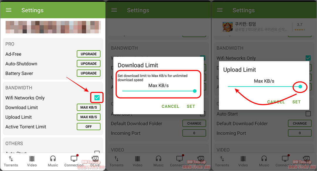 2. BANDWIDTH 카테고리 중 Wifi Networks Only를 체크, Download Limit 항목 속도 MAX, Upload Limit 항목 속도 5~10KB로 게이지바 이동