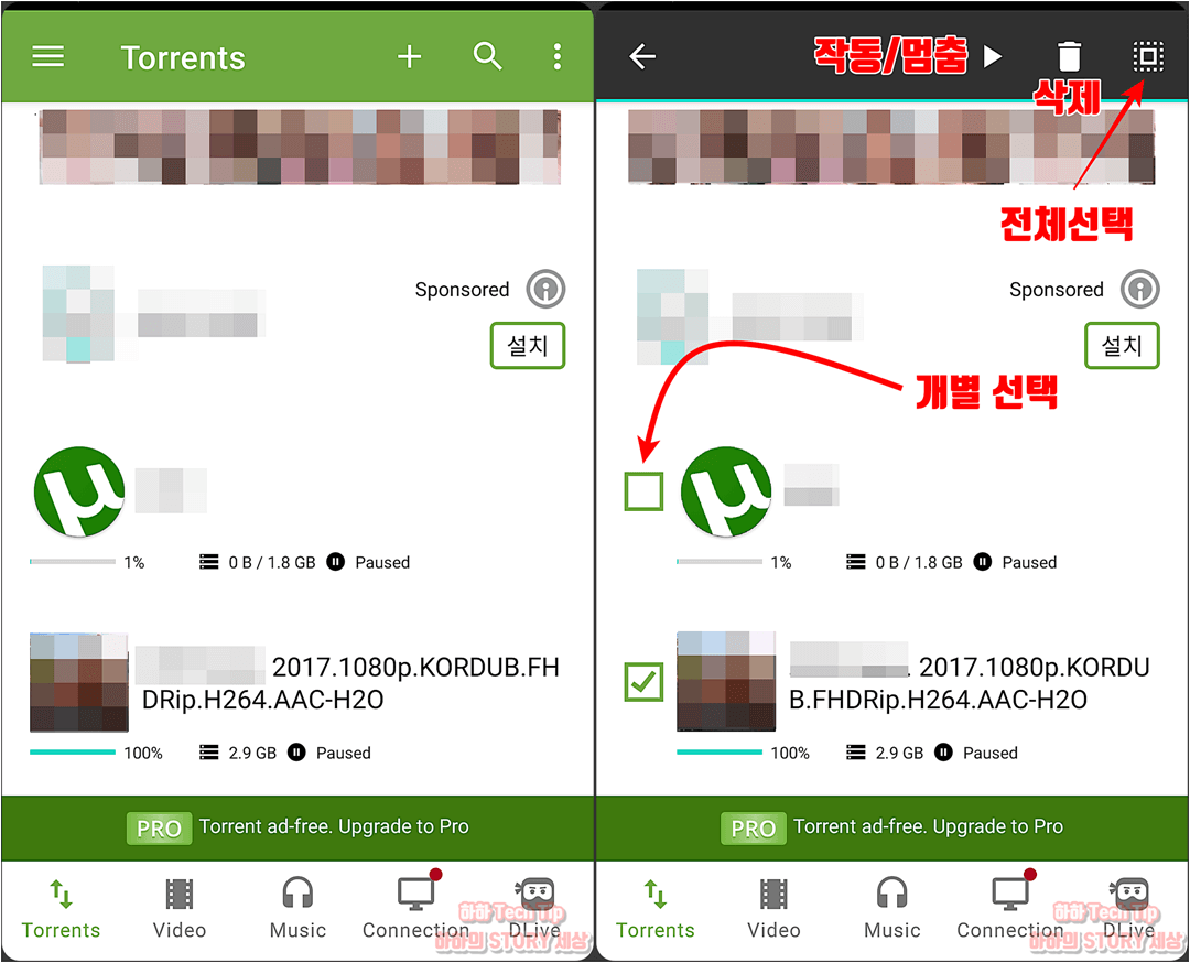 유토렌트 사용 중 핸드폰에 부하를 주는 작업이나 잠시 멈추고 싶을 때에는 파일에 손가락을 대고 있으면 우측 상단에 작동/멈춤, 삭제, 전체선택/해제 기능이 활성화되는데, PC에서 조작하는 쾌적함을 모바일에서도 느낄 수 있다.