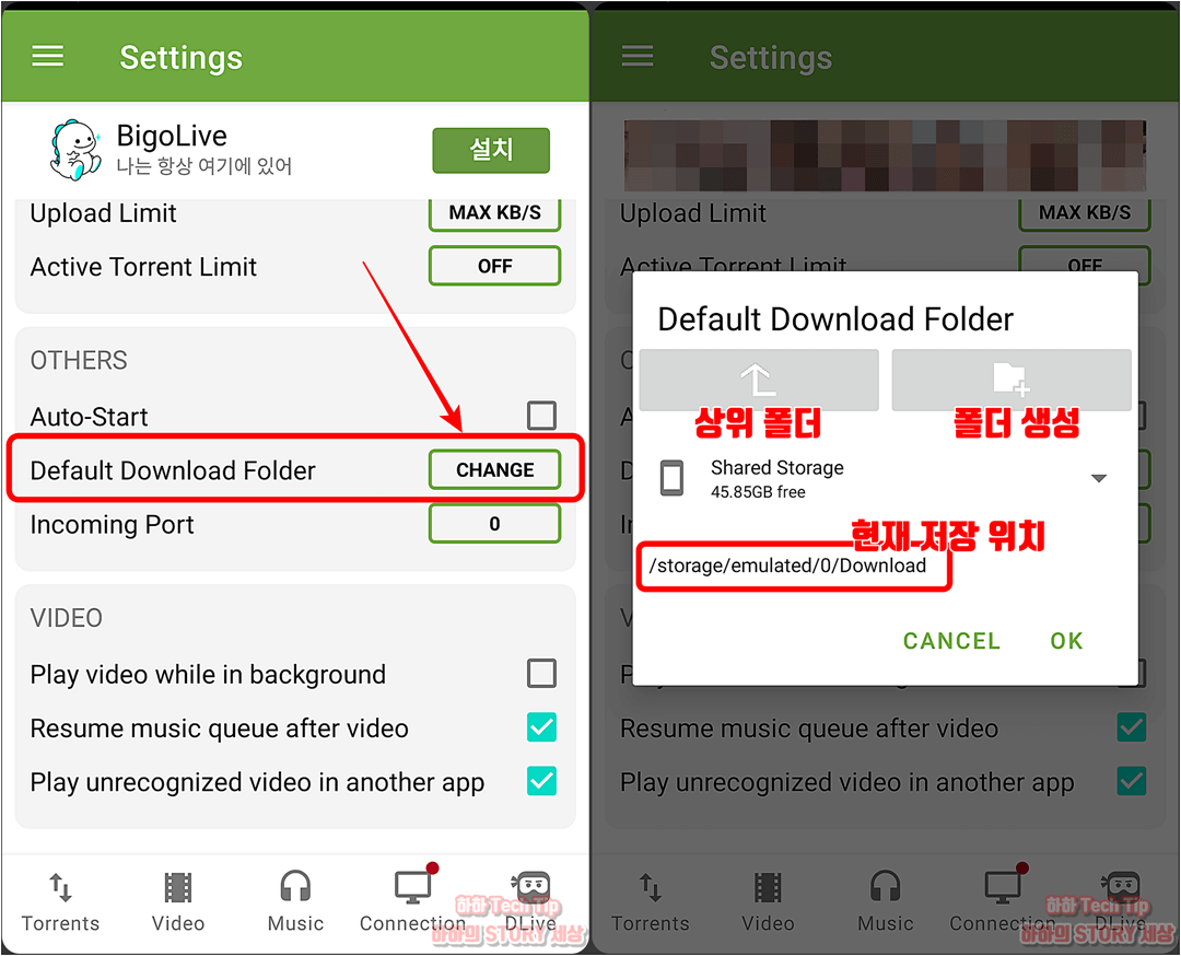 토렌트에서 다운받은 파일은 핸드폰 내부 저장장치 Download 폴더로 이동되며, 전용 폴더를 생성해서 별도로 받고 싶을 때는 OTHERS 카테고리로 이동해 Default Download Folder에서 변경하면 된다.