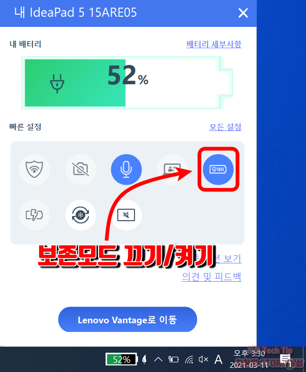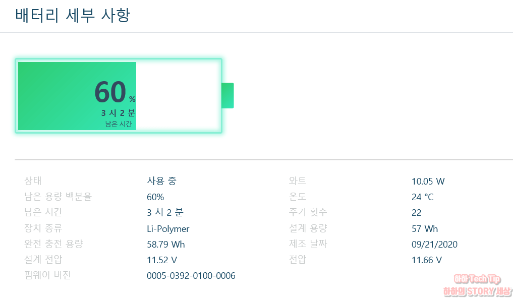 다만 단점이 하나 있는데, 수명 연장을 위해 60%까지만 충전 관리되기에 외출이나 출장 시 이동 사용 중 전력부족으로 전원 오프 될 수 있기에 사전에 보존 모드를 해제 후 완충해 놓도록 한다.(바탕화면 작업표시줄 아이콘으로 빠르게 전환)