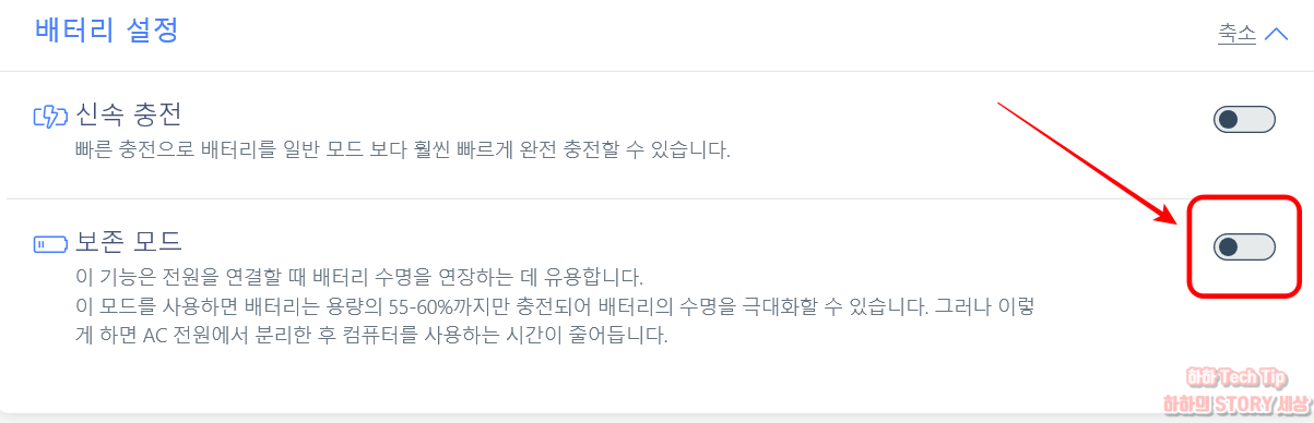 보존 모드는 배터리를 50~60%까지만 충전을 제한하여 집이나 회사에서 거치 모드로 장시간 사용하여도 반복되는 완전 충전으로부터 배터리를 보호한다.