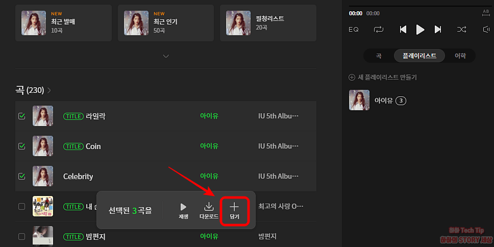 곡 선택 후 담기 버튼을 누르면 "재생목록에 담기"와 "플레이리스트에 담기" 두 가지 옵션이 나타나는데, 첫 번째 재생목록은 지금 듣고 싶은 노래를 장르나 규칙 없이 보관하는 곳으로 곡의 추가 및 삭제가 쉽다.