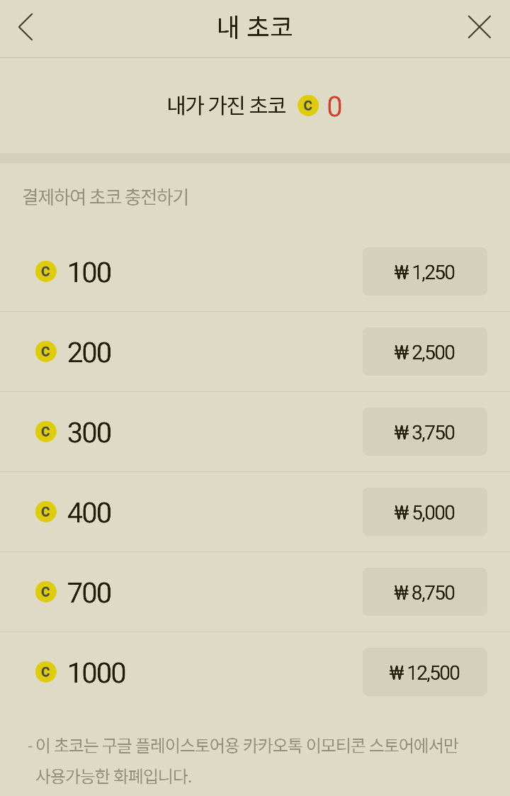 하지만 선택의 폭이 넓어진만큼 다양한 이모티콘을 사용하기 위해서는 초코(c)라는 포인트를 지불해야만 합니다.