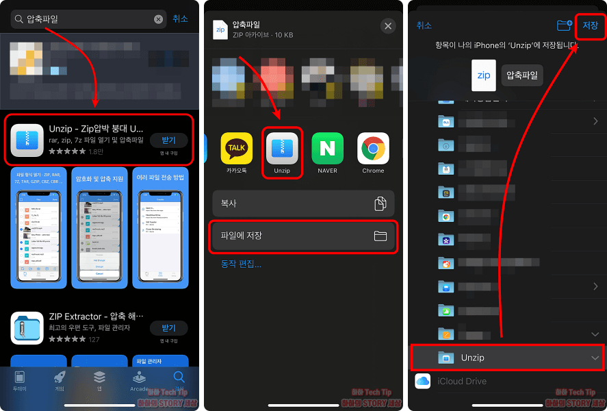 앱 활성화 완료 후 카카오톡에서 전달받은 압축파일을 다시 클릭하면 관련 프로그램에서 Unzip이 추가된 것을 볼 수 있다. Unzip을 실행하면 즉시 압축 해제 단계로 넘어가고 파일에 저장 버튼을 누르면 아이폰 내부로 저장된다.