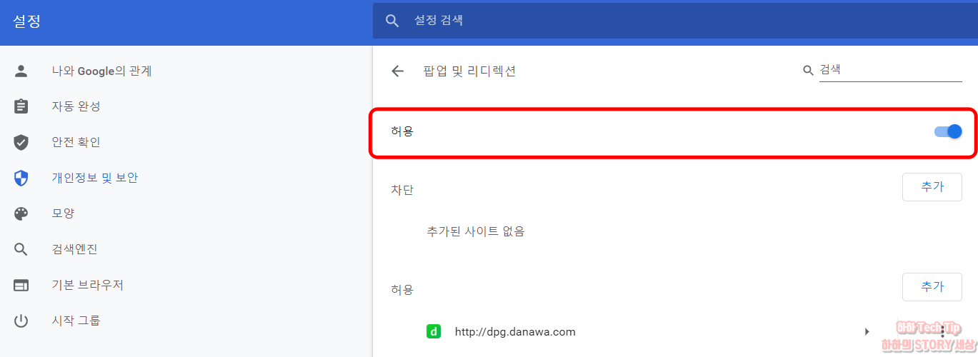 3. 허용 항목에서 버튼을 클릭해 활성화 시킨다.