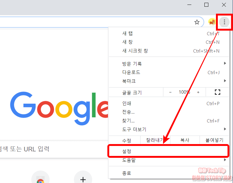 1. 크롬 창 우측 더보기(점세개)를 누른 후 설정을 클릭한다.