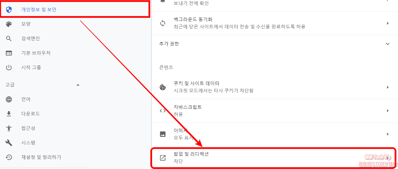 2. 개인정보 및 보안 카테고리 선택 후 팝업 및 리디렉션을 누른다.
