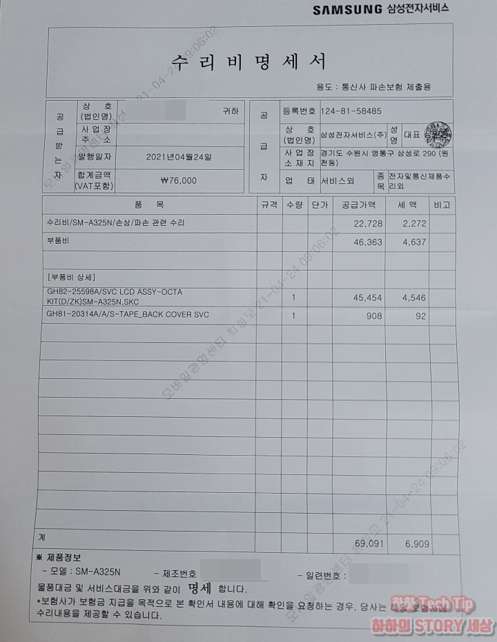 A32 액정 파손으로 수리할 경우 액정 반납 조건으로 인건비 25,000원 부품비 51,000원을 더해 76,000원을 지불한다. 만약 액정 미반납 시 116,500원이 부과되어 40,500원을 더 부담해야 하니 별도로 액정을 판매할 계획이 없다면 반납 조건으로 하는 것이 유리하다.