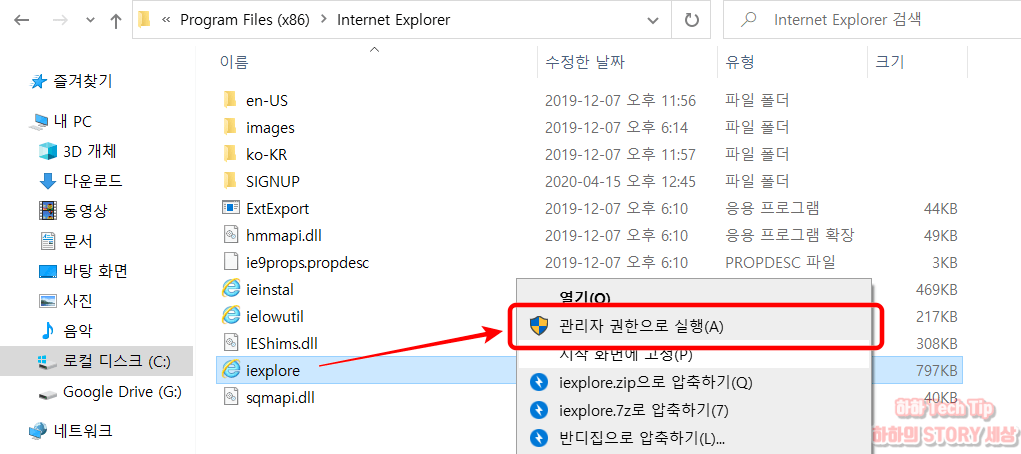 4. iexplore 파일을 마우스 우클릭 후 관리자 권한으로 실행한다.