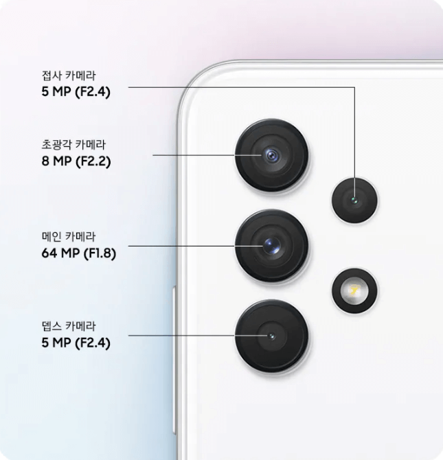 A32에는 후면 4개 전면 1개 모두 5개의 렌즈가 있으며, 손 떨림 방지 기술(OIS)은 적용되지 않는다. 카메라 렌즈 세부 사양은 다음과 같다.