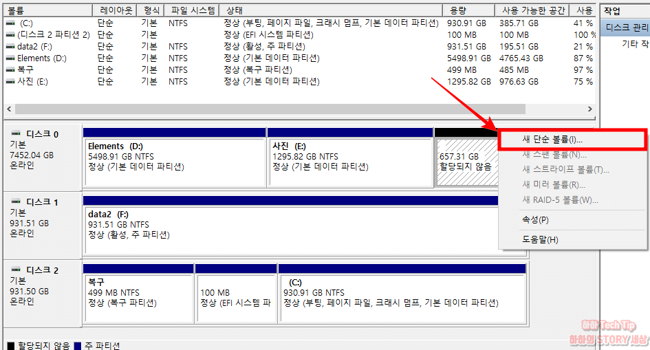 5. 축소가 끝나면 할당되지 않음이라고 표시되는 공간이 생성되는데, 마우스 우클릭해서 새 단순 볼륨을 선택한다.
