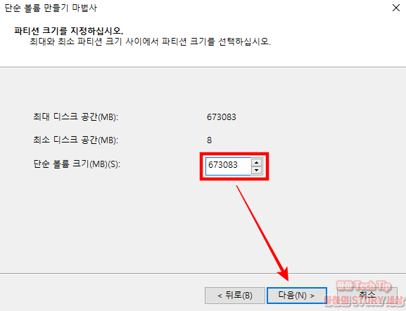 파티션 크기 지정 시 볼륨 축소로 생성된 공간을 모두 다 사용할 수 있도록 최대 디스크 공간 크기를 모두 다 입력해야 버려지는 부분이 없다.
