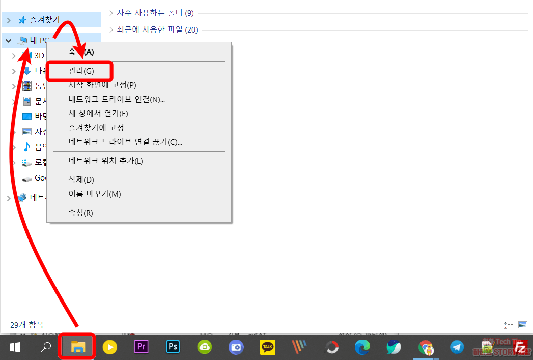 1. 파일 탐색기를 누른 후 내 PC에서 마우스 우클릭하고 관리항목을 선택한다.