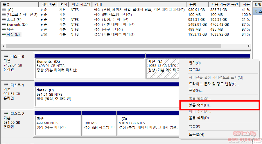 3. 하드디스크 용량을 나누기할 디스크를 선택하고 해당 영역으로 가서 마우스 우클릭 후 볼륨 축소를 클릭한다.
