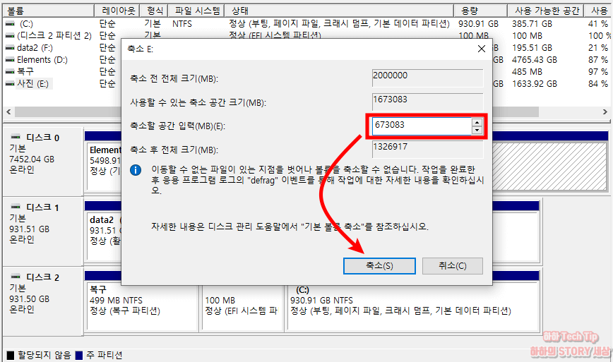 4. 축소 전 전체 크기를 확인하고 축소할 공간 입력에 새로 생성할 드라이브 용량을 결정한다.