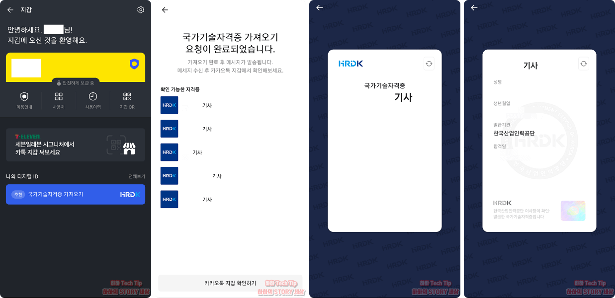 이용 방법은 카카오톡 지갑에서 나의 디지털 ID를 눌러 국가기술 자격증 가져오기를 선택하면 되고 발급되는 자격증에는 자격증 번호, 발급기관, 합격일이 기록되어 있다.
