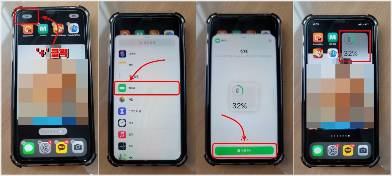 배터리 잔량을 확인 할 수 있는 가장 편리한 방법으로 메인 화면에서 화면을 꾸욱 누르면 위젯을 선택하는 부분이 나타나는데, 왼쪽 상단에 보이는 '+'를 눌러 배터리 위젯을 검색 또는 직접 찾아서 추가하면 바탕화면에서 배터리 잔량이 표시된다.