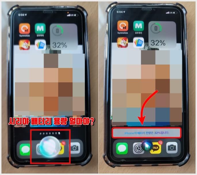 시리를 호출하여 배터리 용량을 알 수 있으며, 배터리 용량 얼마나 남았어?처럼 질문을 하면 현재 잔량을 정확하게 알려준다. 이 방법은 한 손만 사용할 수 있거나 스마트폰이 멀리 떨어져 있을 때 사용하면 효과적이다.
