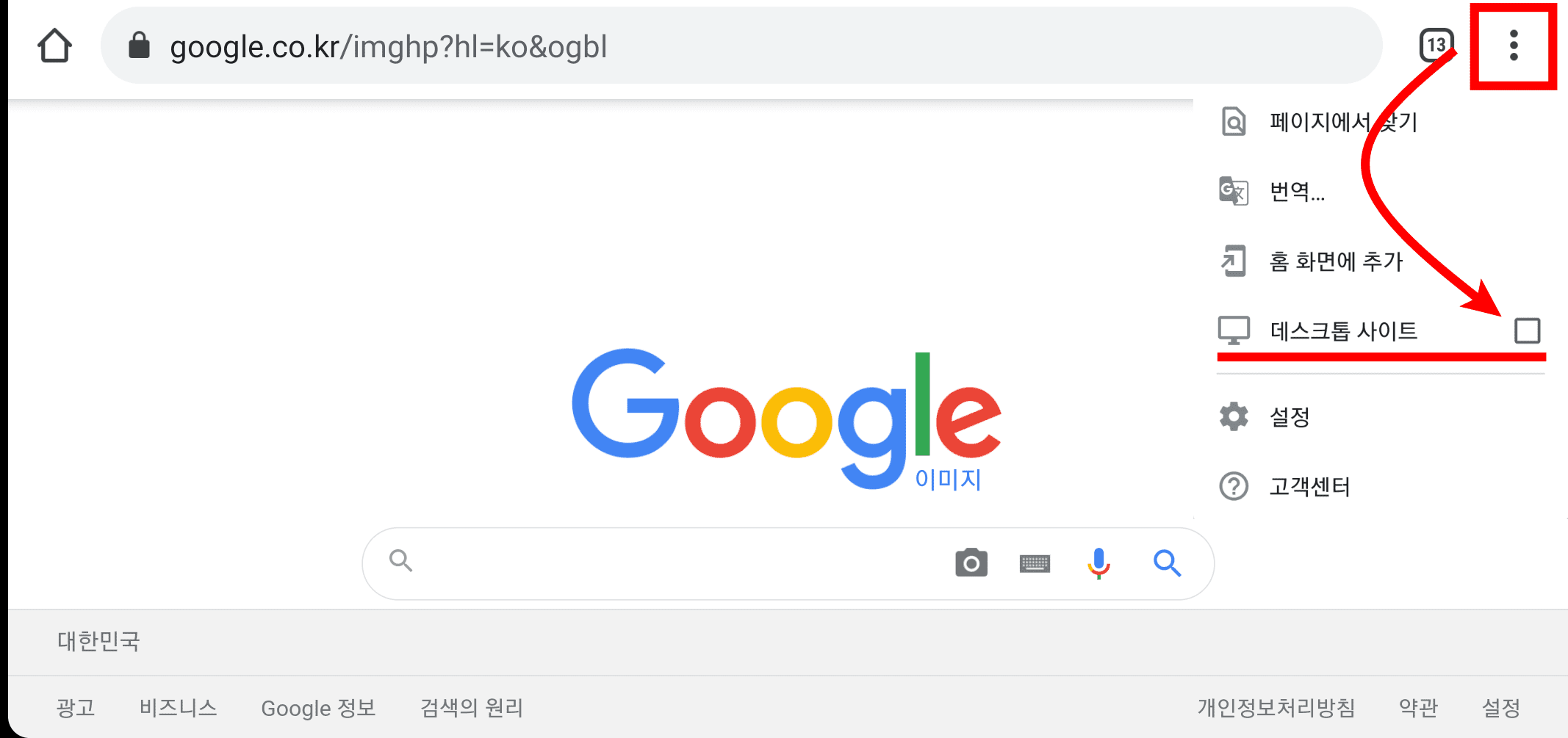 모바일 브라우저에서는 PC 환경처럼 간단하게 검색하기 어렵기 때문에 컴퓨터에서 사용하는 웹 브라우저로 변환해서 사용하며, 다음과 같은 방법으로 진행한다.