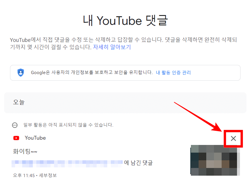 4. 내 유튜브 댓글 창에서 내가 그동안 남긴 댓글을 확인 할 수 있으며, X 아이콘을 누르면 댓글이 삭제된다.
