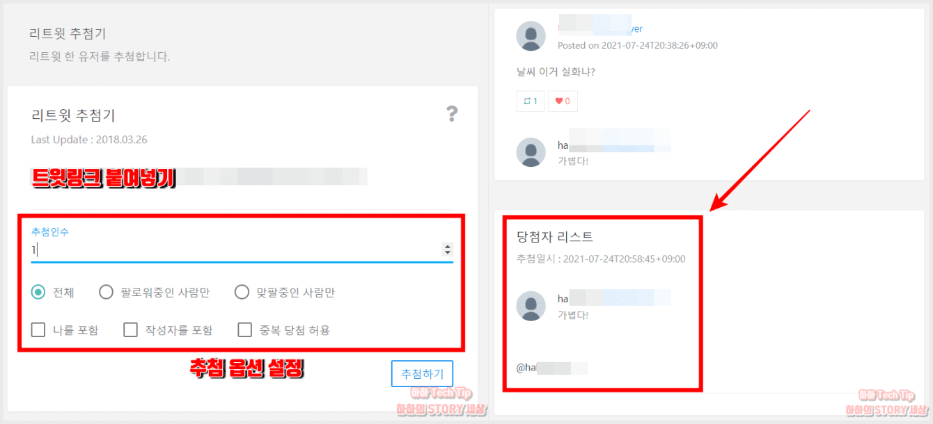 - 화면 아래로 스크롤 하면 리트윗을 한 사람과 당첨자 리스트가 나타난다.