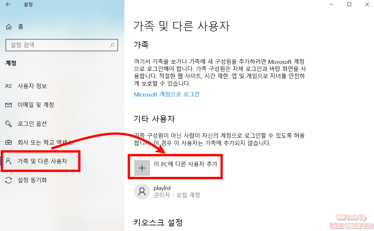 4) 가족 및 다른 사용자에서 이 PC에 다른 사용자 추가 버튼을 누른다.