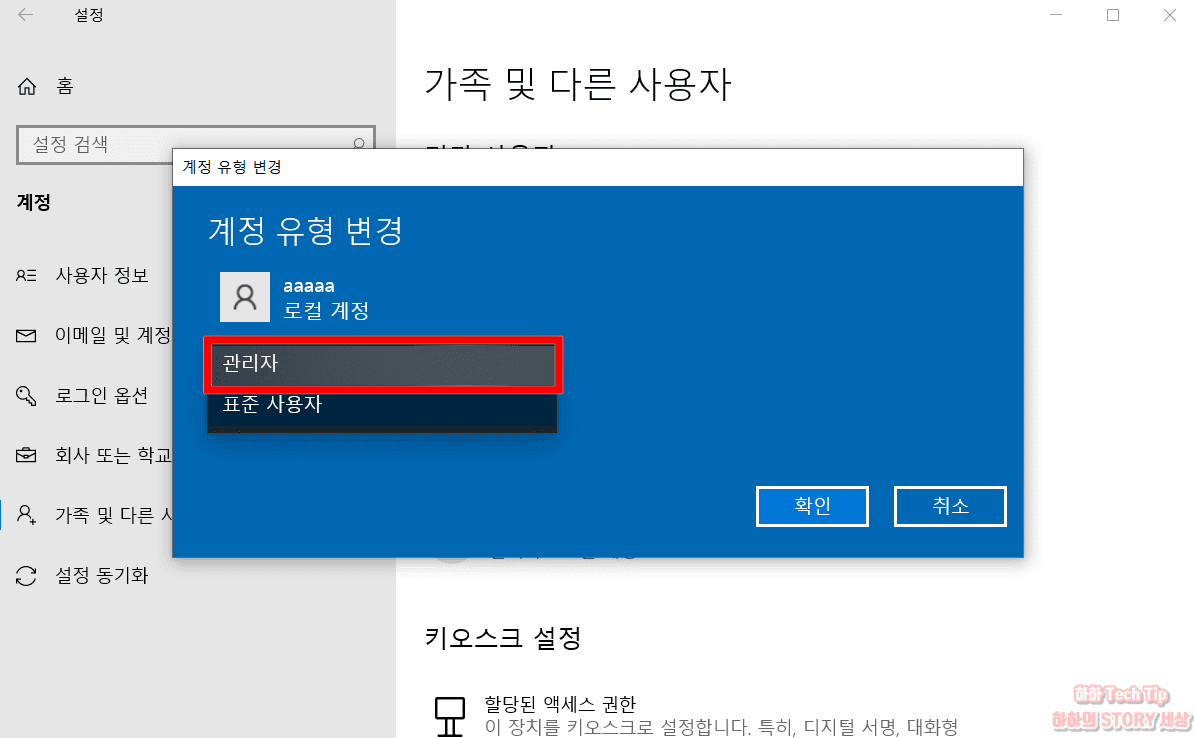 8) 새로 생성한 계정을 선택하고 계정 유형 변경을 눌러 계정 유형을 표준 사용자에서 관리자로 바꾼다.