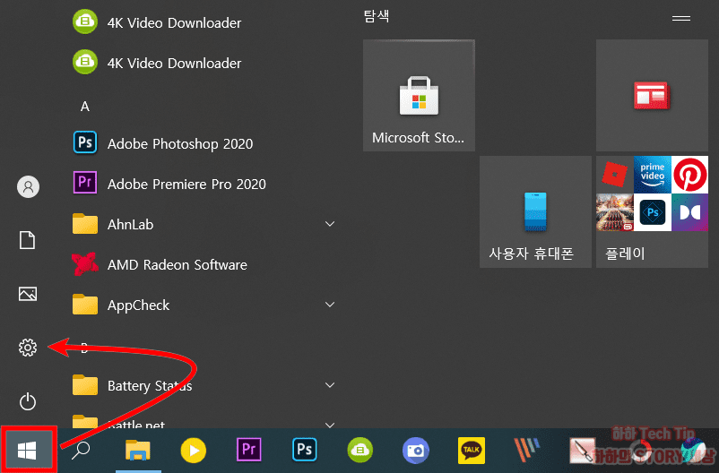 2) 윈도우 시작 버튼을 눌러 설정 아이콘을 선택한다.