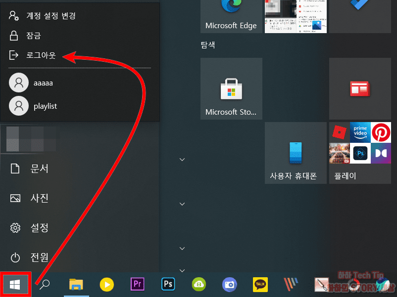 9) 윈도우 버튼을 눌러 계정 선택 후 현재 로그인 상태를 로그아웃한다.(현재 사용중인 창 모두 종료됨)
