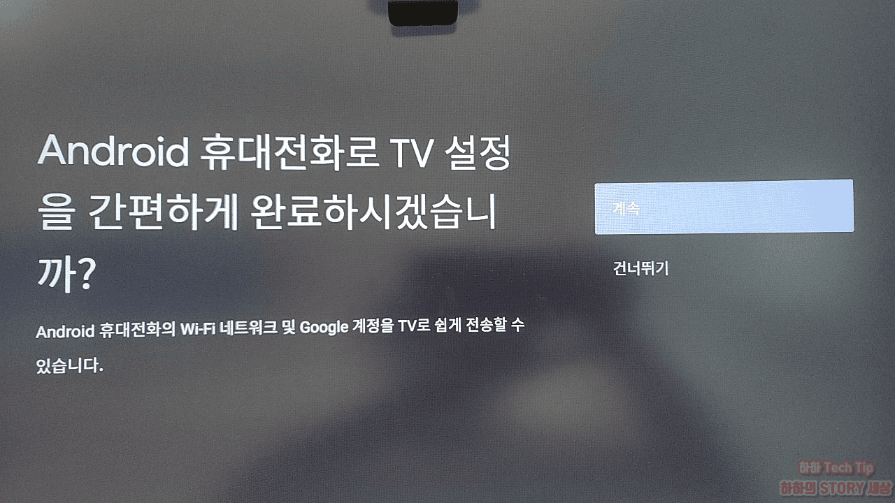 1) 전원이 투입되고 안드로이드 TV 설정 화면이 나오면 계속을 누른다.
