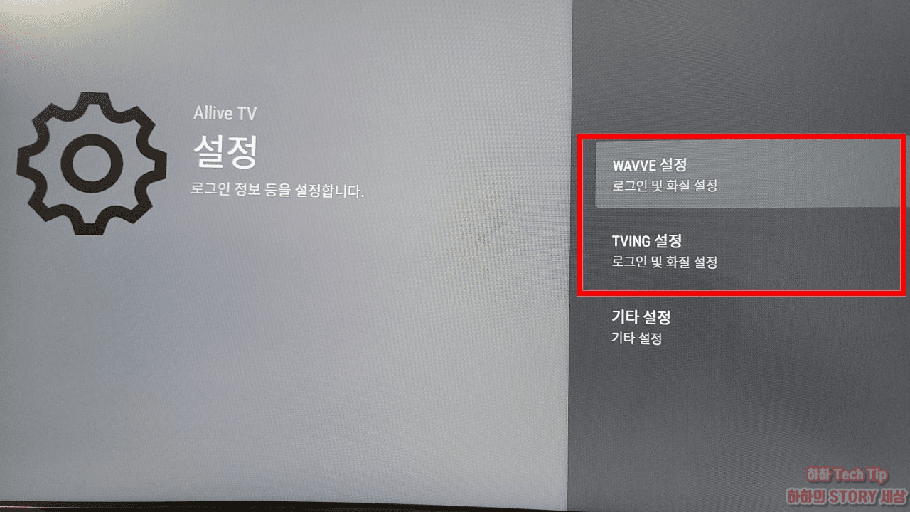 5) 설정 카테고리로 이동 후 웨이브와 티빙에서 로그인, 비밀번호, 화질을 선택한다. 무료 라이브 채널 사용을 위해 로그인이 필요하니 아직 회원이 아니라면 웨이브(Wavve)와 티빙(Tving) 가입 방법을 참고한다.