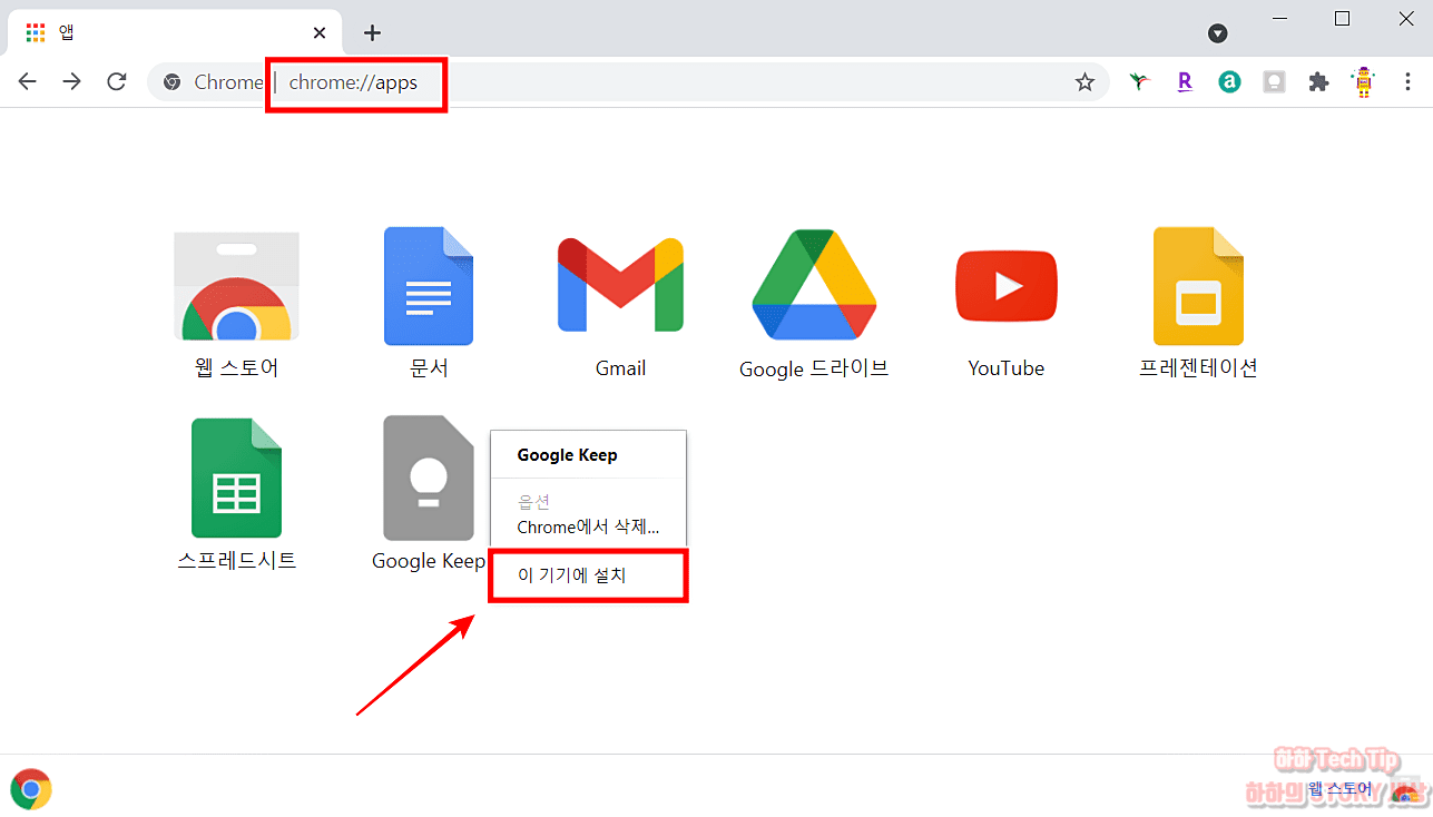 2) 구글 킵 활성화를 위해 마우스 오른쪽 클릭 후 이 기기에 설치를 선택한다.