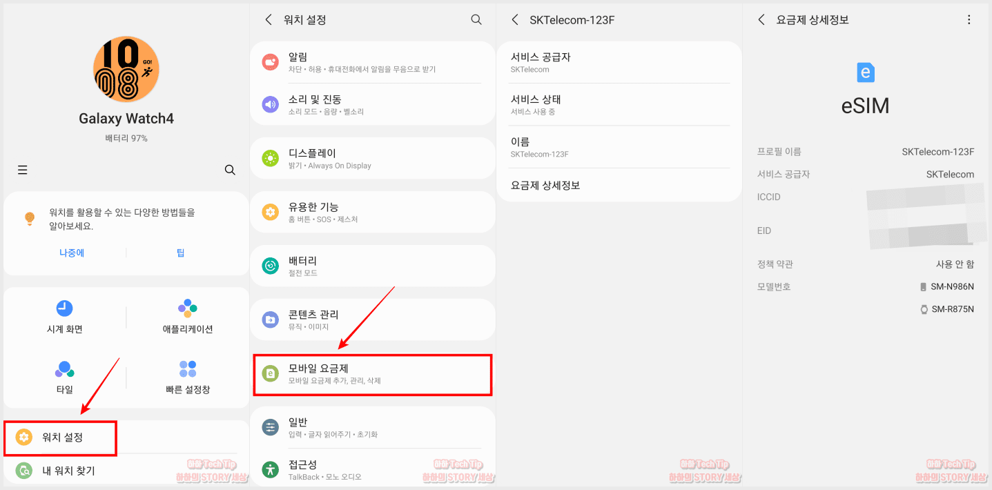 3) 갤럭시 워치 4가 통신사와 제대로 연결되었는지 확인해야 하는데, 워치 설정 → 모바일 요금제 항목으로 이동하면 사용 중인 통신사와 서비스 상태를 알 수 있다. 워치에 설치된 esim 정보는 요금제 상세정보를 누르면 된다.