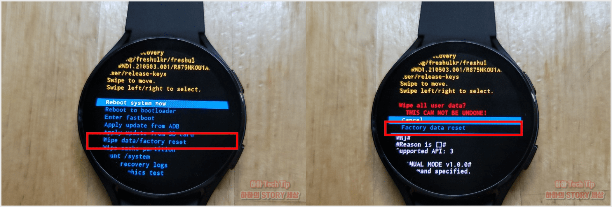 6) 데이터 삭제 경고창에서 Factory data reset 항목을 선택하면 공장 초기화가 완료된다.