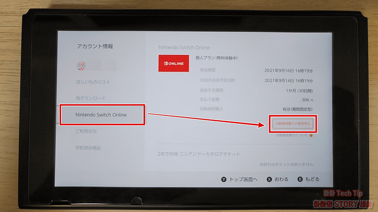 14) 닌텐도 스위치 온라인 카테고리에서 자동 구입 갱신 정지를 누르면 완료된다.