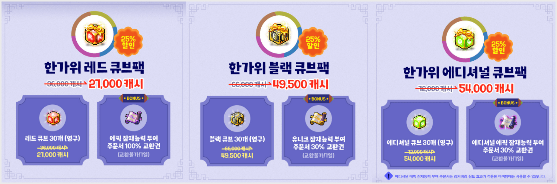 한가위 에디셔널 큐브팩은 에디셔널 큐브 30개(영구)를 25% 할인된 54,000 캐시에 판매하고 에디셔널 에픽 잠재능력 부여 주문서 30% 교환권을 함께 제공한다.